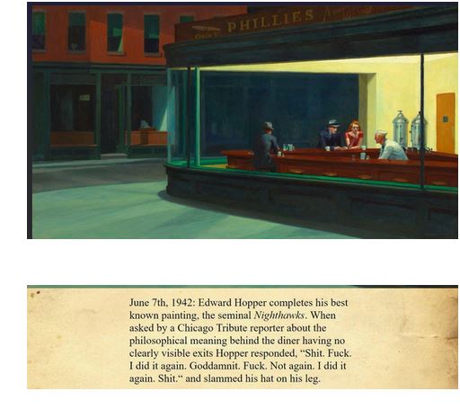 I also quote Peter Schjeldahl, the great art critic at The New Yorker magazine: Hopper painted with reproducibility on his mind, as a new function and fate of images in his time. This is part of what makes him modern--and persistently misunderstood, as merely an illustrator. If Nighthawks is an illustration, a kick in the head is a lullaby."