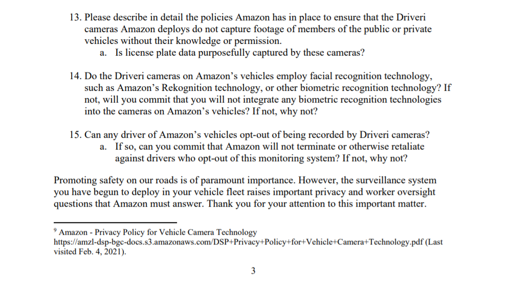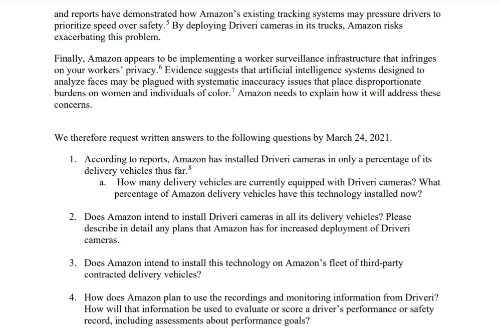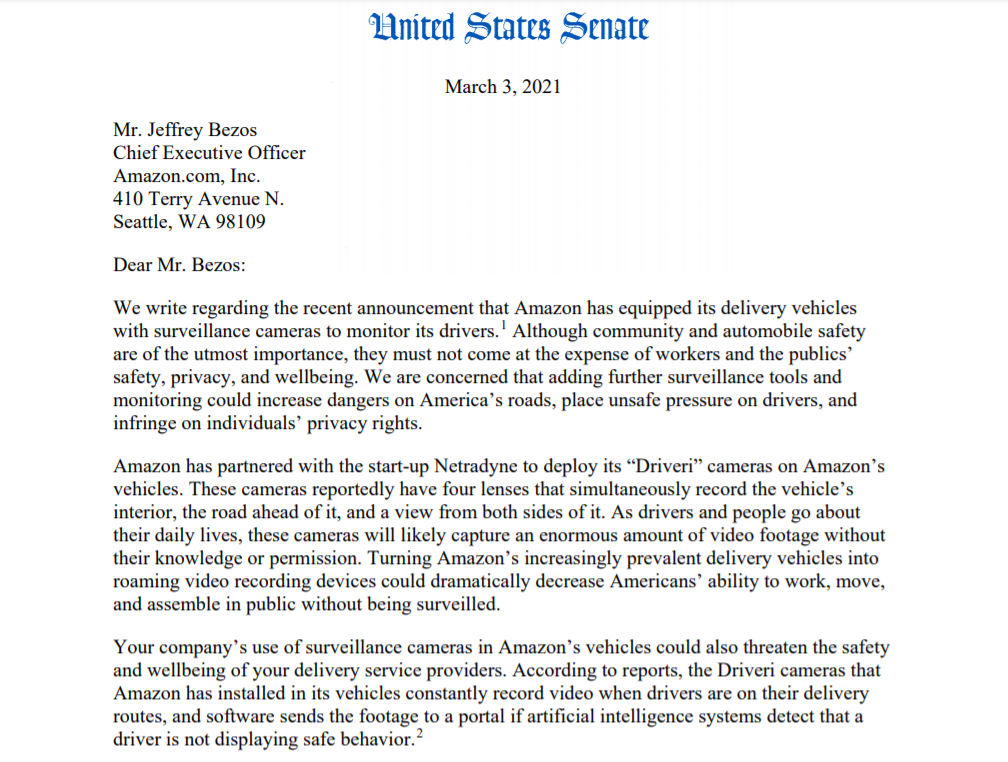 (54,006 posts)to Jeff Bezos asking him to provide more information on the companys recent deployment of surveillance cameras in vehicles used by contracted delivery drivers.