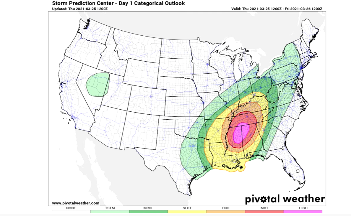 The Storm Prediction Center has upgraded your region to a High Risk for tornadoes and severe storms today. It looks like it might be worse than last week. A 30% chance of a tornado hitting within 25 miles of you might not seem like much, but it is. Stay safe everyone!