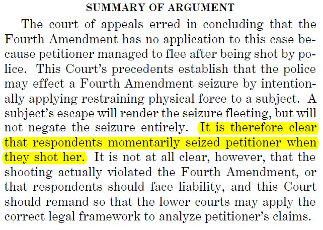 Note also that the majority isn't saying that the constitution prohibited the police shooting in this case. That's not the question. Rather, the question is whether the Fourth Amendment even applies in the first place. The lawfulness of the officers' conduct is still TBD.
