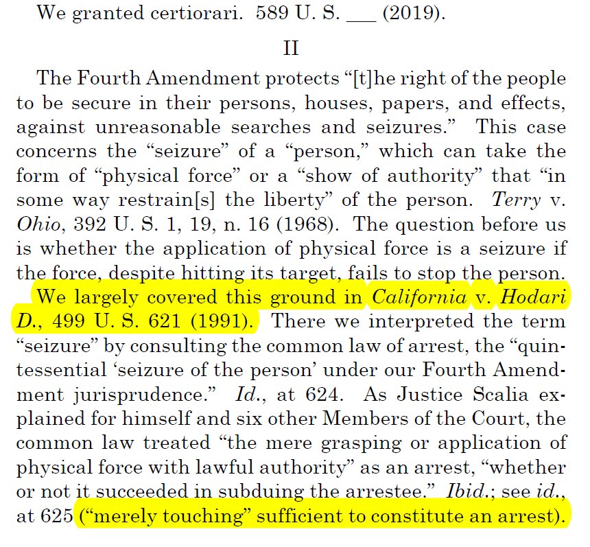 Here, though, as the SG rightly noted in its brief, the answer to the question was essentially settled 20 years ago, in an opinion by Justice Antonin Scalia in which the Court was unanimous in the view that the police seize someone when they initiate physical contact.