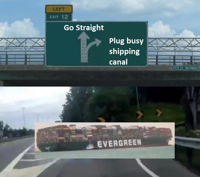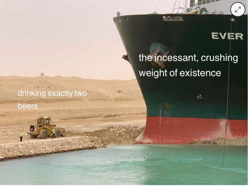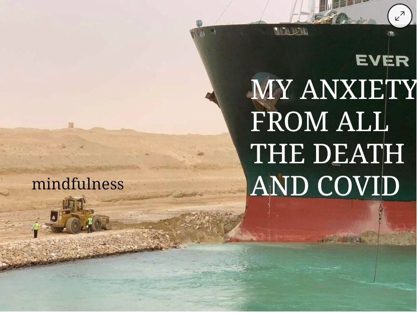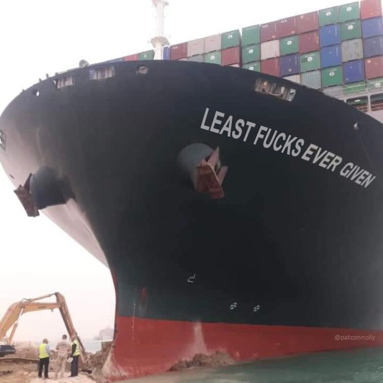 My therapist had not seen the boat, even though photos of it had already begun to be manufactured into memes about lifes existential problems and the stupid little things we all do to feel some control over them. I asked her to Google it in front of me, because I had become obsessed. Since Tuesday afternoon, in fact, I have thought about little else. The first photos I saw of it were taken by workers on the Maersk Denver, the ship that was immediately behind the Ever Given when a wind storm is suspected to have blown her sideways. (Yes, the boats are girls.) I spent much of yesterday hunting down photos of the boat, both in situ and in happier times. I acquainted myself with websites like VesselFinder and MarineTraffic, as well as with the concept of Suezmax and the phrase bulbous bow, which the Ever Given has and which means that she is not just on top of the sand, but also lodged inside it.