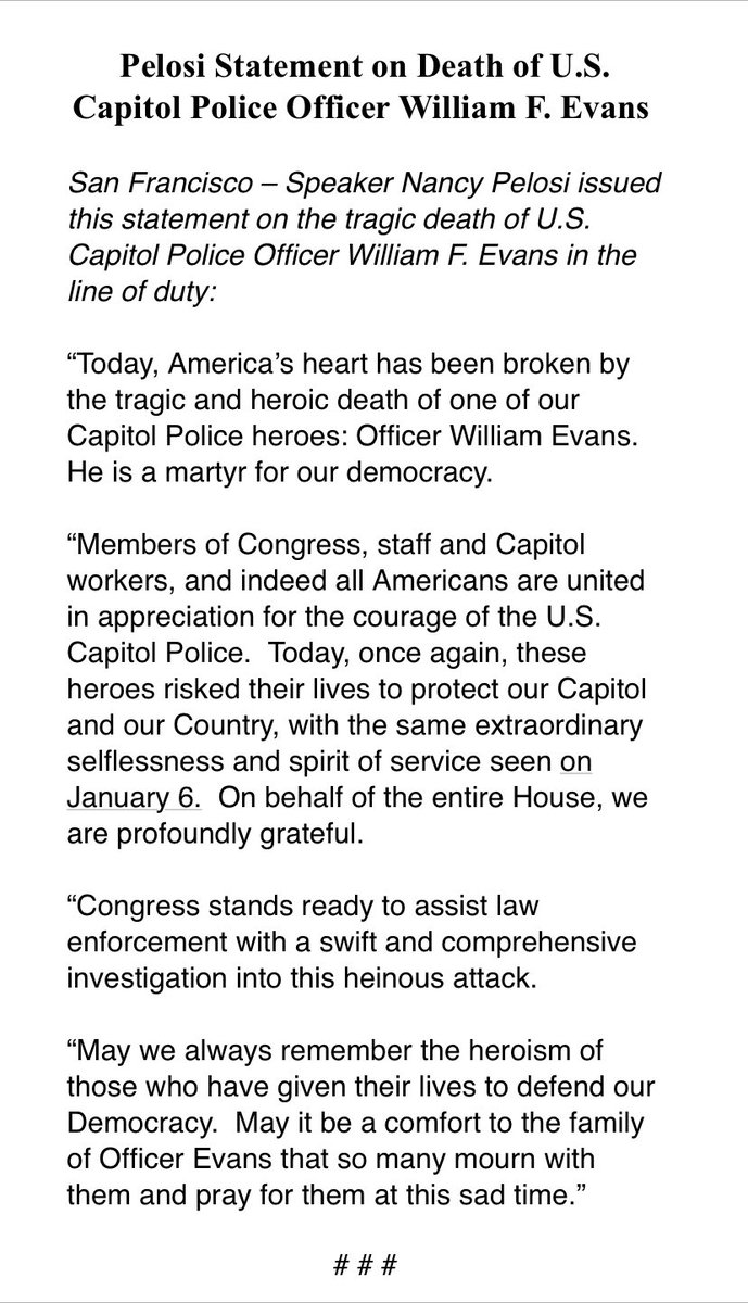 @SpeakerPelosi releases statement on the deadly attack today that killed a Capitol Police officer. (Original Post)