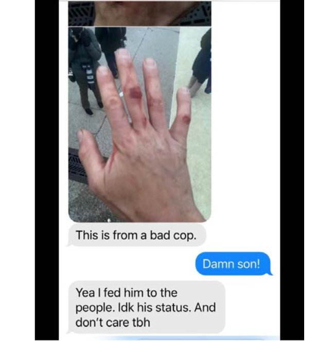 Prosecutors say that Whitton texted a photo of his injured hand to a friend after the riot, saying, "This is from a bad cop."