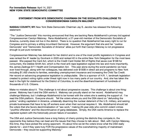Related: Editorials & Other Articles, Issue Forums, Alliance Forums, Region ForumsStatement from the NY State Democratic Committee supporting Representative Carolyn Maloney: