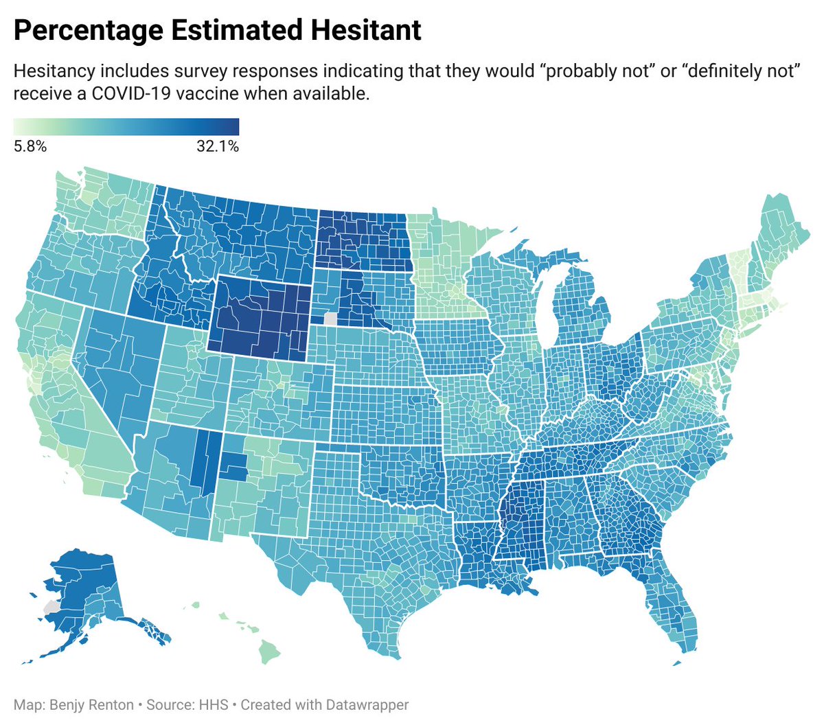 (12,804 posts)These should be taken with a pretty big grain of salt, given the layers of abstraction between these models and the actual views of the population. (You've got two different surveys, a model to connect the two, and then further statistical tricks to get county-level approximations.) One warning sign: the map of county-level hesitancy estimates shows pretty big differences on state lines. The idea that Minnesota as a whole might have different levels of vaccine hesitancy than North Dakota as a whole is plausible. But eastern North Dakota having hesitancy rates two to three times higher than similarly rural counties just over the Red River? That suggests something's up with the data.