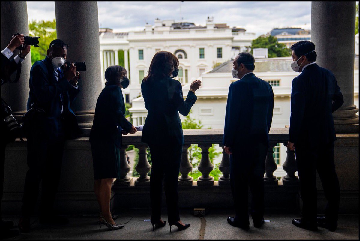 Vice President Kamala Harris talks with Prime Minister of Japan H.E. Suga Yoshihide on the balcony of her office overlooking the West Wing. @VP