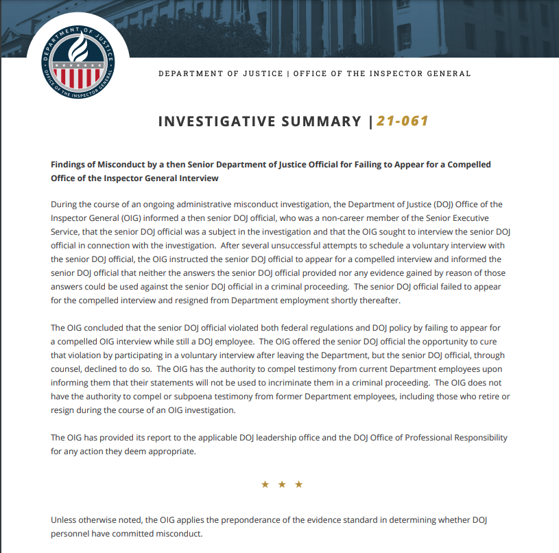 A now-former non-career "senior DOJ official" failed to show up for a compelled interview with the inspector general's office during a misconduct investigation, per newly released summary. The ex-official isn't named, as is standard with these summaries, and resigned soon after