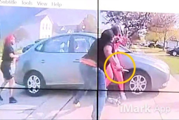 Everyone was standing around in the driveway. Ma'khia was in a bit of a face-off with a girl in shorts. As he approached the two interacted and Ma'khia swung the knife at the girl in shorts. It was really close.