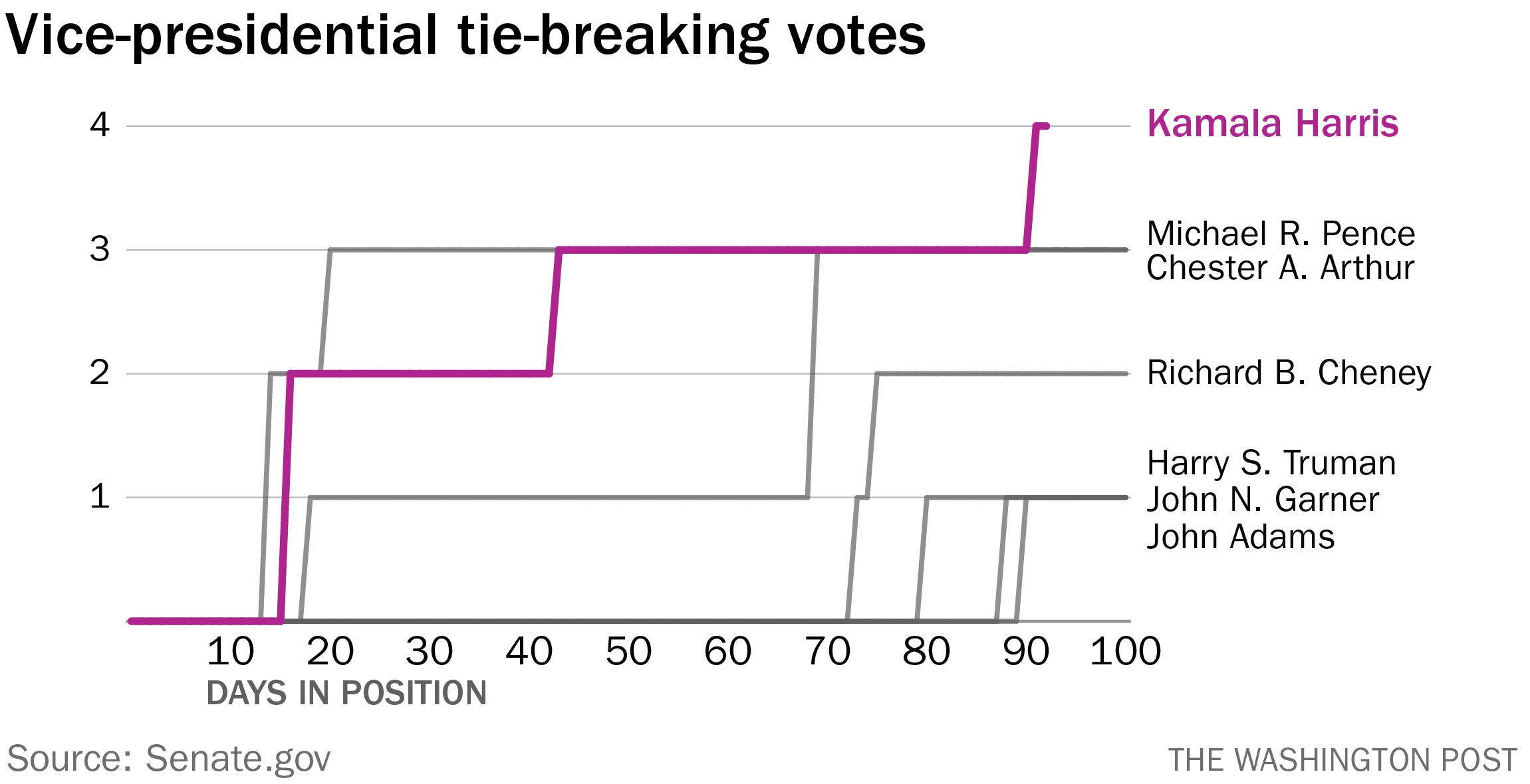 Then along came Kamala D. Harris. On Wednesday, as Bloombergs Greg Giroux pointed out, she cast her fourth tiebreaking vote as vice president. Its a faster pace than any prior vice president.