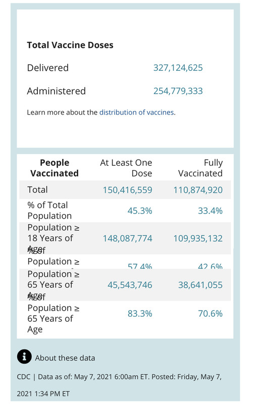 California has done 63% of the eligible population now with one dose. And 43% both doses. Which is much more useful information.