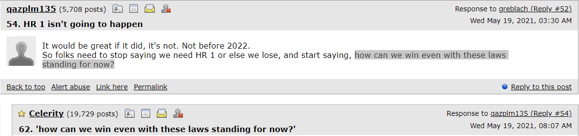 So folks need to stop saying we need HR 1 or else we lose, and start saying, how can we win even with these laws standing for now?