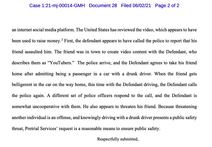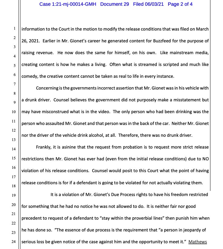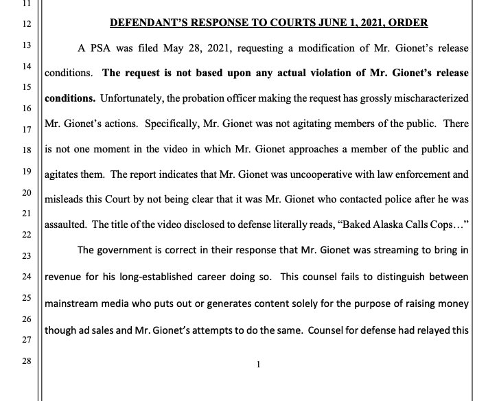 Gionet's atty filed a response disputing he'd violated any release condition, saying he needs to make videos for the web to earn a living, and calling probation's request for stricter conditions "asinine" https://assets.documentcloud.org/documents/20797643/6-3-21-anthime-gionet-response.pdf