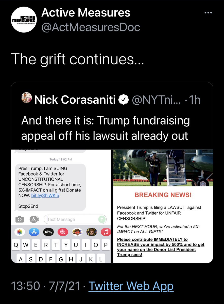 Presumably Trump or his lawyers know this. The purpose of the lawsuit isn't really to win it. It's to give him more ammo for his incessant grifting -- raising more money from followers who are eager to show their support for him, now by "sticking it" to Facebook, Twitter, and Google.