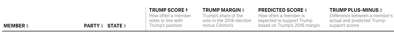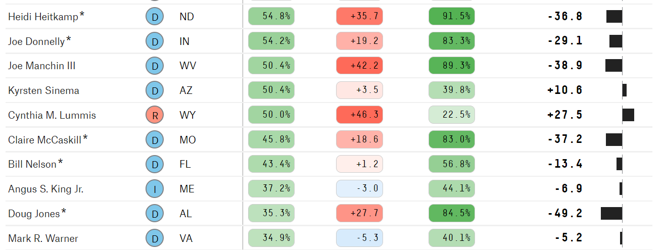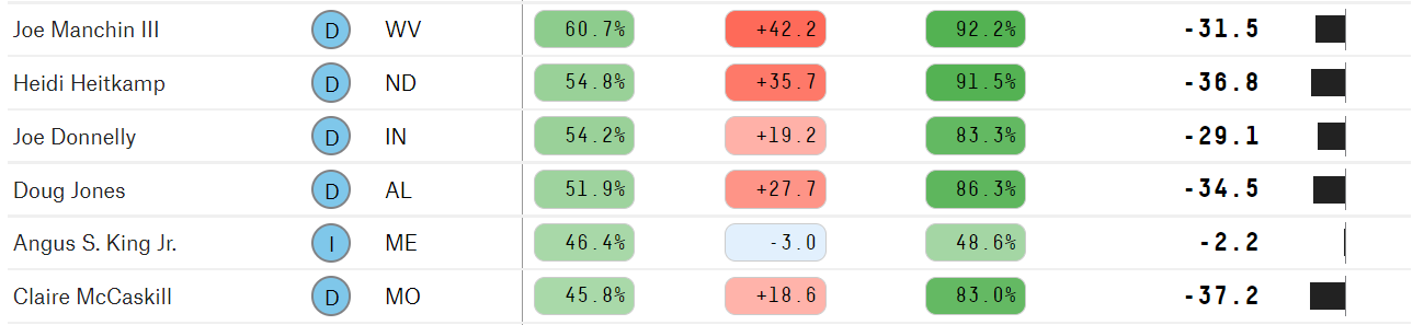(54,238 posts)There literally is no one left in the Senate other than those 2 who voted over 50% of the time with Trump, they all lost (Heitkamp, Donnelly, Doug Jones). Even above 40% lost too (Nelson from FL and McCaskill) Warner and King did vote above 40% in the 115th, but not overall.