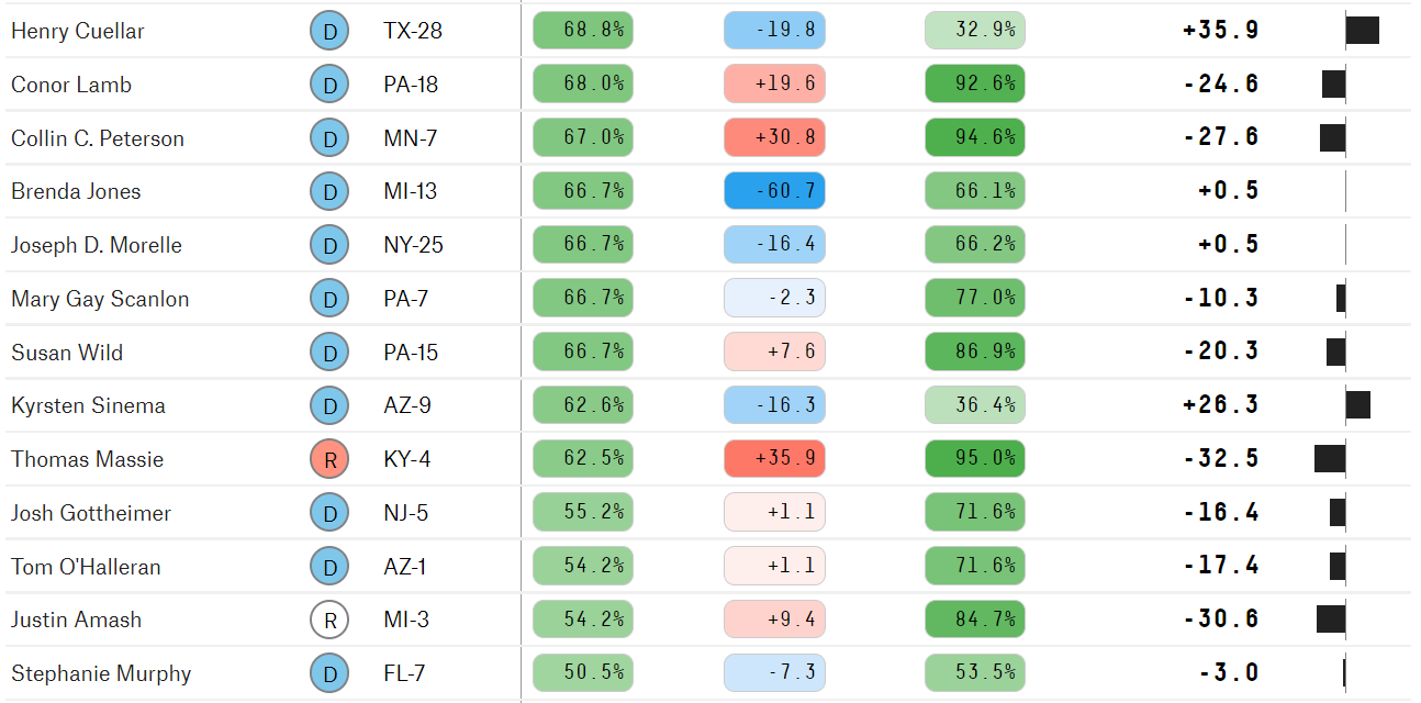 House (Cuellar & Sinema have by far the highest +/- of any Dem, meaning they both voted so much higher with Trump than predicted by their constituents in their district)