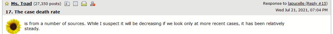 (38,643 posts)The number i used was 2%. I was not using a prediction that it Wii be lower in the future, for anything other than nothing the very thing you accuse me of ignoring: acknowledging that in an ongoing pandemic the case fatality rate is not stable. The predicted instability (i.e. That it will change on The future, or was different I. The past) does not figure into the the calculations I made to compare the number of deaths expected from a vaccinated population if the deaths were due to a reduction in severity v. a reduction in infection at all. I used the current case fatality rate on current data. It would be invalid to use it on data from the beginning of the pandemic. It would be invalid to extrapolate into the future. I an not doing either of those.