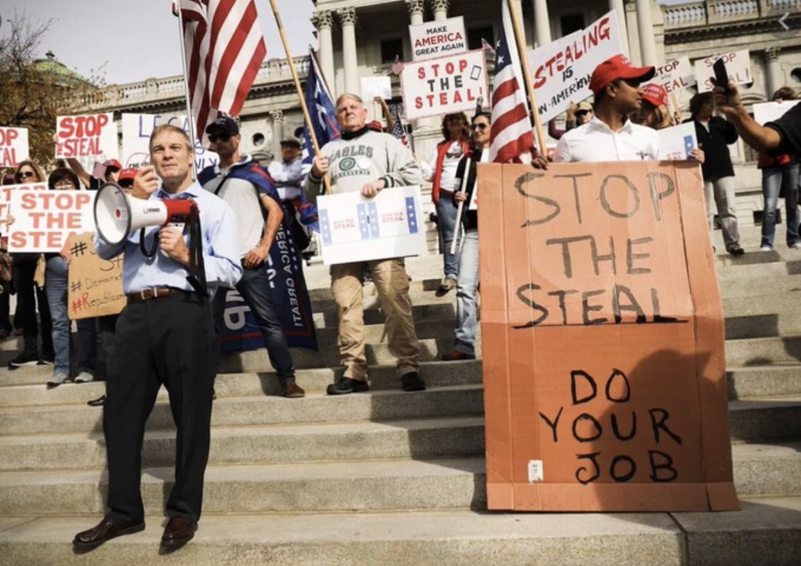 Samuel Lazar a Trump fanatic who is currently incarcerated and facing felony charges because he sprayed a line of police officers with mace at the Capitol on Jan. 6 standing behind Jim Jordan at a Stop the Steal rally.
