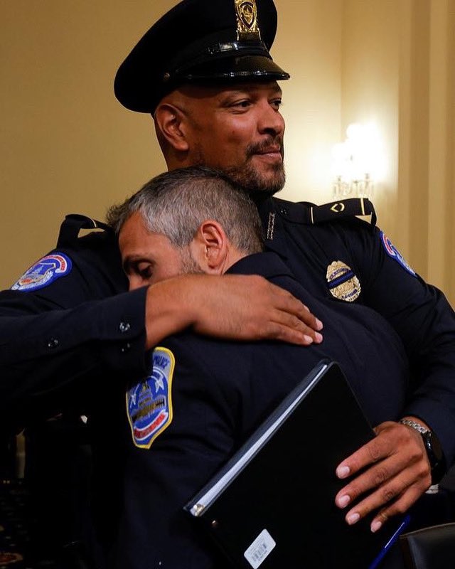 (4,064 posts)What a hug. I am so glad that one of the outcomes of yesterday's testimony was that these fine men who went to hell and back to save our democracy and our members of Congress and their staffs from violence and possible death got to connect with one another as they did.
