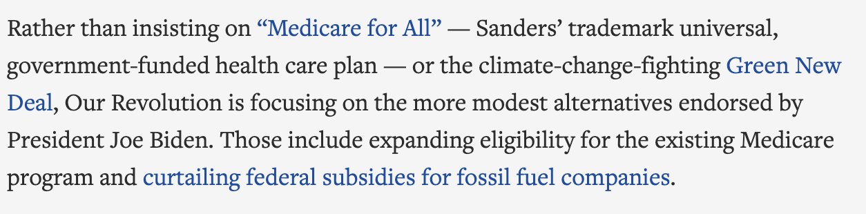 Rather than insisting on Medicare for All Sanders trademark universal, government-funded health care plan or the climate-change-fighting Green New Deal, Our Revolution is focusing on the more modest alternatives endorsed by President Joe Biden. Those include expanding eligibility for the existing Medicare program and curtailing federal subsidies for fossil fuel companies.