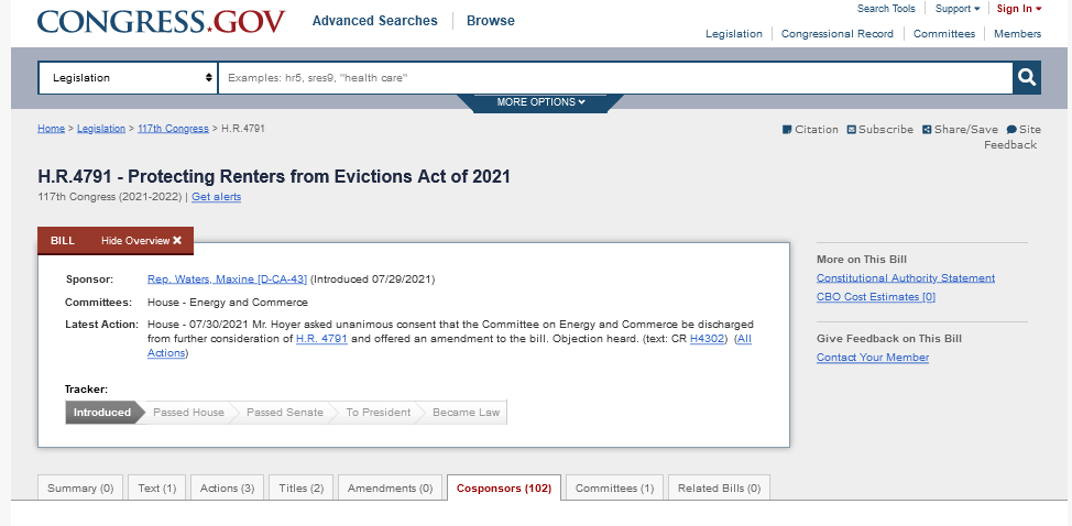 On July 29, 2021, Congresswoman Maxine Waters introduced H.R. 4791, the Protecting Renters from Evictions Act of 2021, which would extend the eviction moratorium until December 31, 2021.