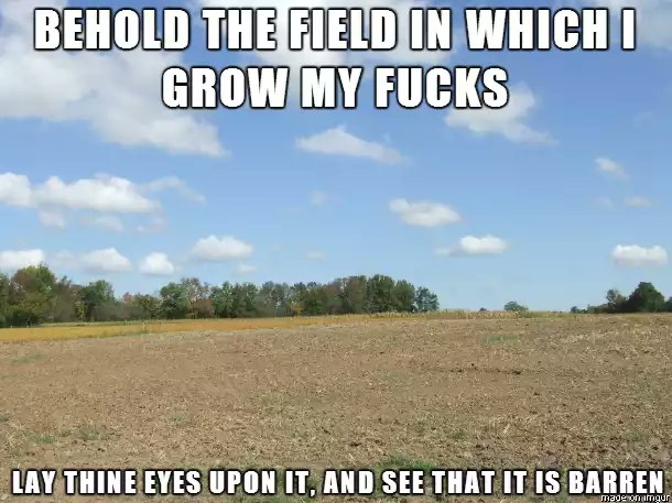 (15,578 posts)Behold! The fields in which I grow my fucks. Lay thine eyes upon it and thou shalt see that it is barren.