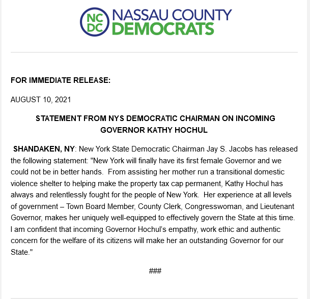 STATEMENT FROM NYS DEMOCRATIC CHAIRMAN ON INCOMING GOVERNOR KATHY HOCHUL (Original Post)