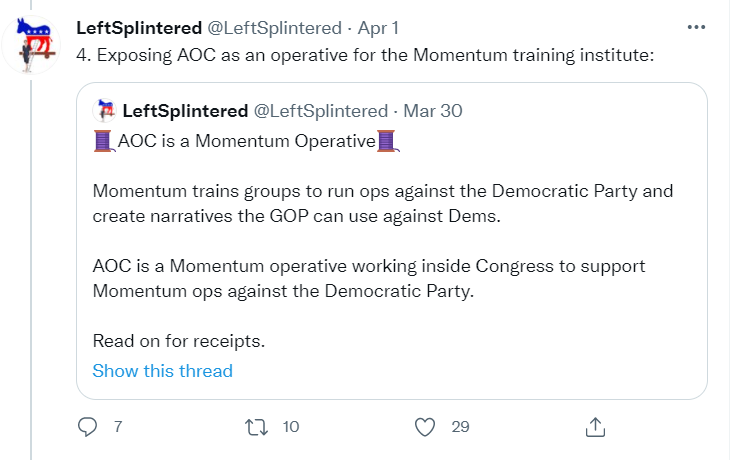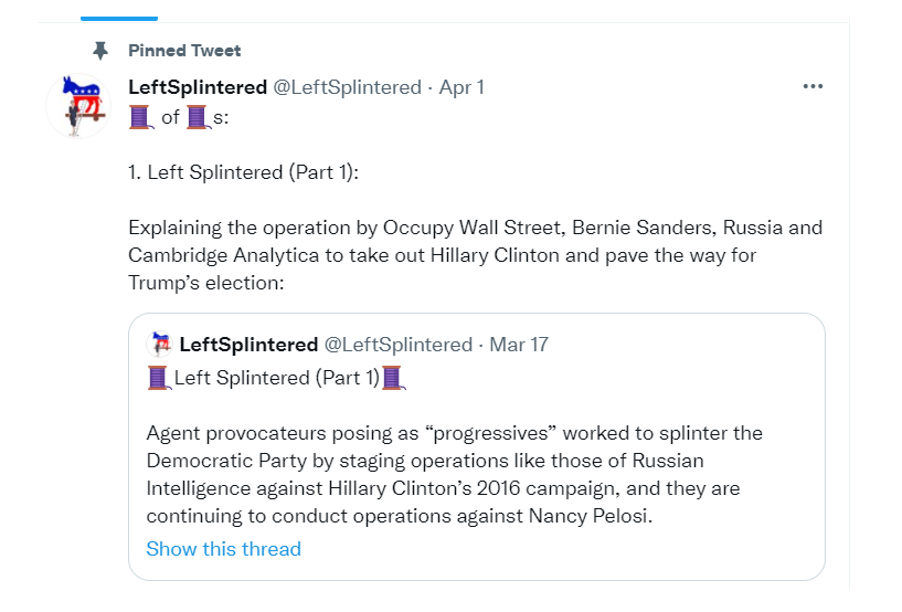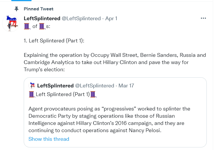 That @LeftSplintered twitter troll YOU are posting is literally accusing AOC, Bernie Sanders and Occupy Wall Street, etc of working with the Russians to bring down Clinton, Pelosi and the Democratic Party.