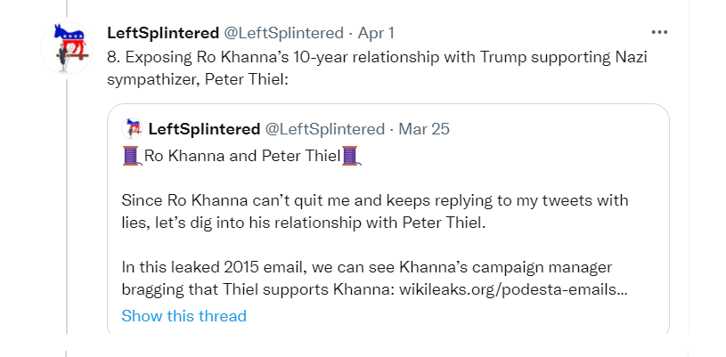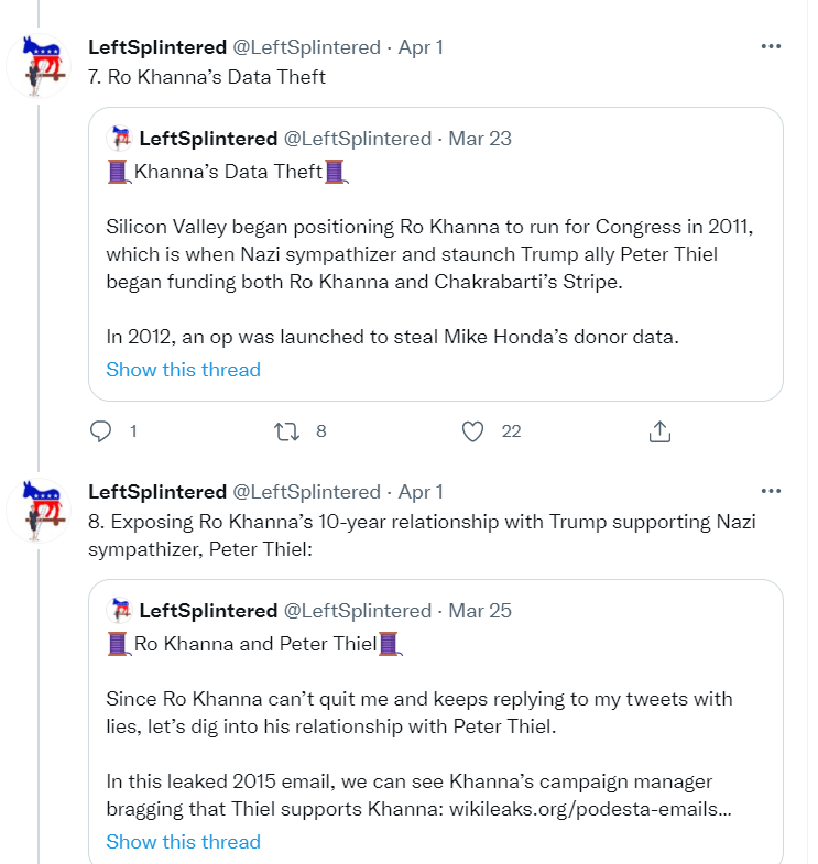 this is another DUer (this DUer posts OP about him, posts his tweets) pumping Spandan Chakrabarti clinging to Ro Khanna, who your other Twitter troll in post # 20 ripped and implied Khanna had neo Nazi ties. Your 2 posted twitter trolls are at odds! Oh noes!