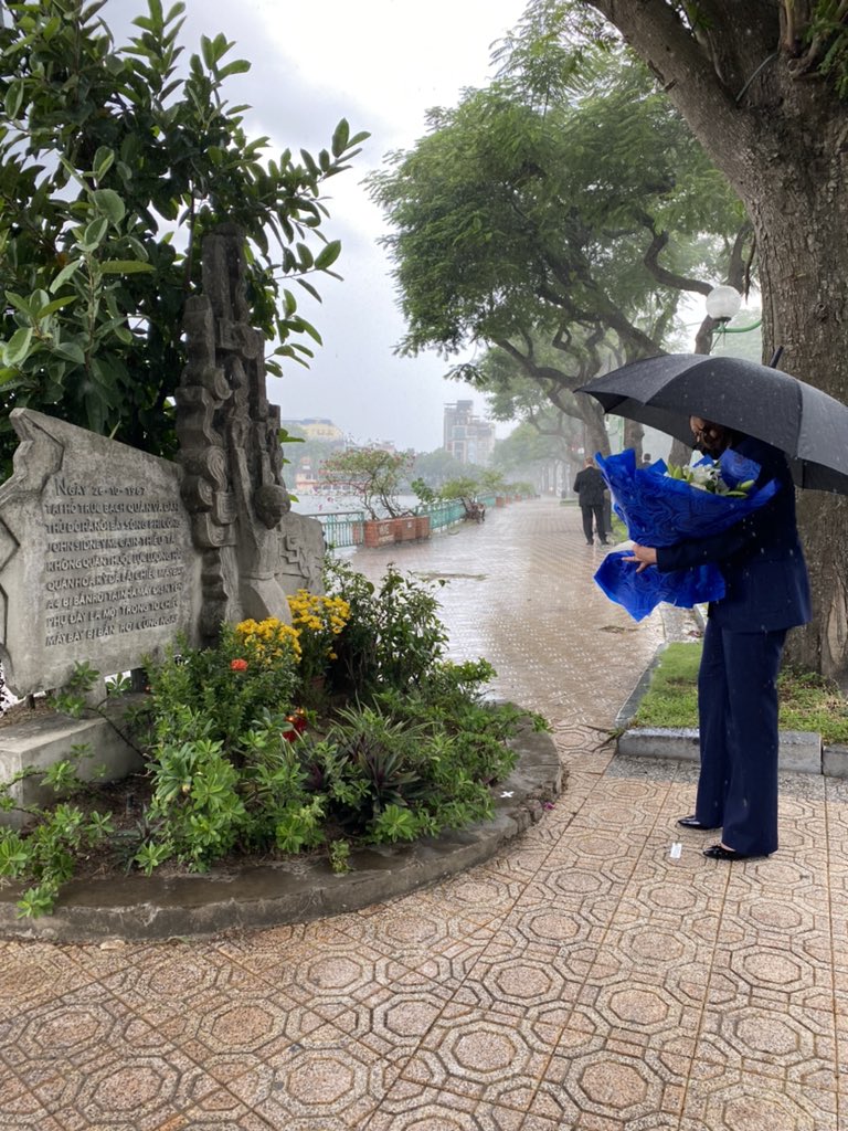 In the pouring rain here in Hanoi, VP Harris took a moment of silence and laid flowers at the monument where John McCains plane was shot down by the North Vietnamese in 1967. Its the three-year anniversary of McCains death.