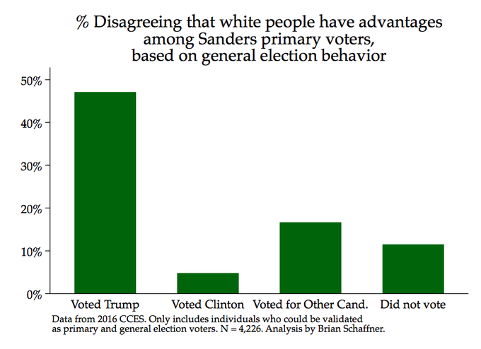 There's another thread today seeking to excuse Jill Stein and Susan Sarandon (two hyper-privileged white women) for their part in getting Trump elected, instead blaming what the OP calls "Trump switcher" voters. It is interesting, though, that Professor Schaffner did note a racial component in his initial analysis of the "Trump switcher" (another poster's term) voter data.
