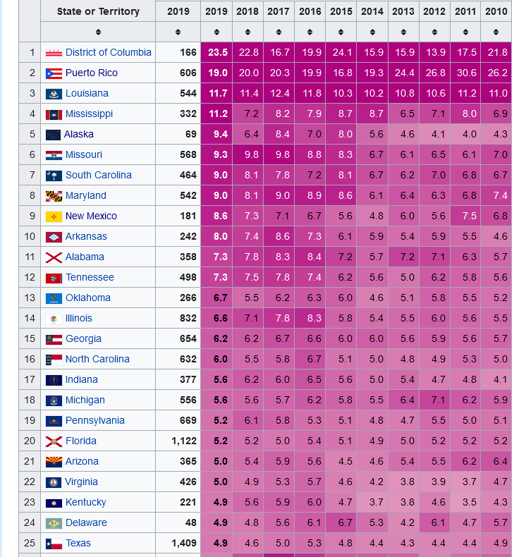 chicago has a lot of gun violence. i googled cities with highest murder rates. this is from fbi crime stats 2019 (article published april 2021):