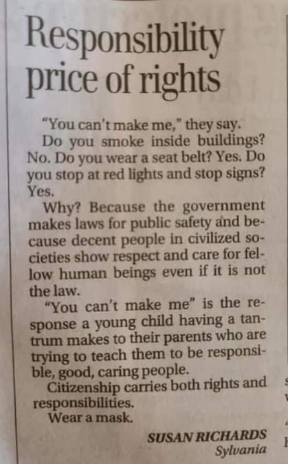 And they're right. Freedom isn't free. It comes with responsibilities, like wearing a mask.