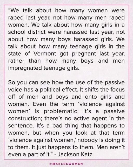 Related: Editorials & Other Articles, Issue Forums, Alliance Forums, Region ForumsHow passive voice makes men invisible in reference to sexual assault and domestic violence