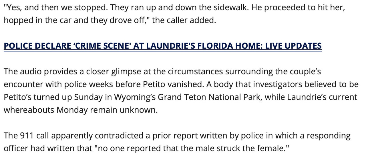 So, it turns out that the 911 caller who reported the 8/12 incident between Gabby Petito and Brian Laundrie reported seeing him slapping and hitting her. This is the info that the police had going into the situation. They failed her. https://t.co/tOLiZDZpCA pic.twitter.com/Mdy7vOigCy