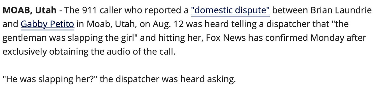 https://www.fox13news.com/news/911-call-released-in-gabby-petito-brian-laundrie-incident-in-utah-the-gentleman-was-slapping-the-girl?taid=6148d45ae56df4000174df5d&utm_campaign=trueanthem&utm_medium=trueanthem&utm_source=twitter]