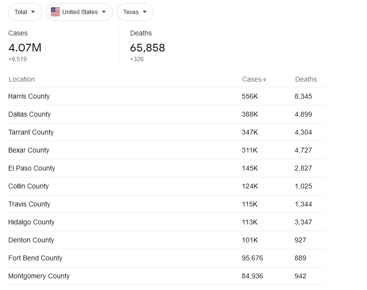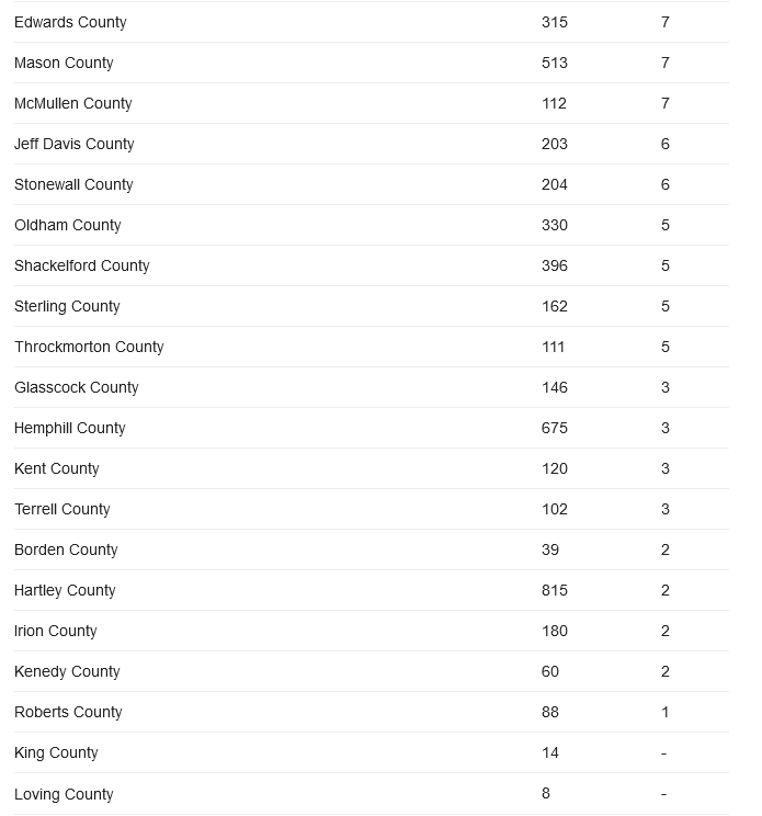 BTW: The reddest counties in Texas which apparently have the highest Covid death rates all have populations under 6,000 and the here are the actual deaths numbers, not rates: