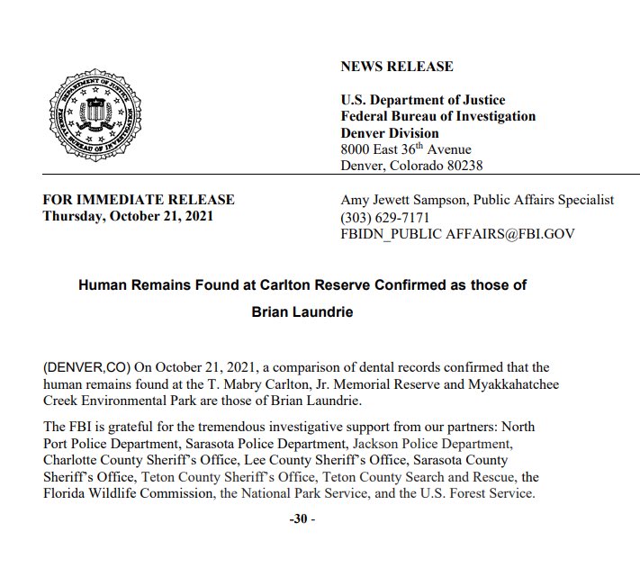 Dental records confirm that the human remains recovered at the Florida environmental park are of Brian Laundrie, the FBI said on Thursday.