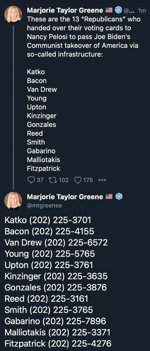 Rep. Marjorie Taylor Greene (R-Ga.), in her typically understated fashion, warned last week that any Republican who voted for the bill would be a traitor to our party, a traitor to their voters and a traitor to our donors. After the vote, she accused the 13 of having voted to pass Joe Bidens Communist takeover of America and tweeted the phone numbers to their congressional offices (while for some reason only listing 12 of the 13).