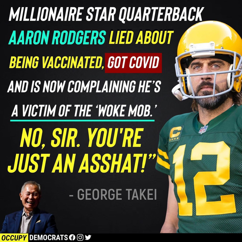 (20,200 posts)about how much he's costing the people of Green Bay (it's a community owned football team) for his daily COVID testing, and how much he's costing the team while he's not playing during his quarantine. Several Green Bay players have had COVID this season, so I guess he's not the only person on the anti-vax train. This costs the organization a bunch of money. But why would he care. It's not his money.