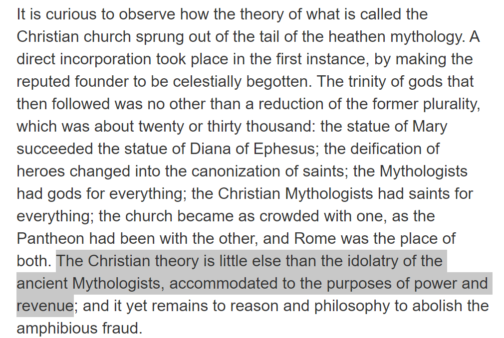 (10,252 posts)" , , , it is necessary to the happiness of man, that he be mentally faithful to him-self. Infidelity does not consist in believing, or in disbelieving; it consists in professing to believe what he does not believe. It is impossible to calculate the moral mischief, if I may so express it, that mental lying has produced in society. When a man has so far corrupted and prostituted the chastity of his mind, as to subscribe his professional belief to things he does not believe, he has prepared himself for