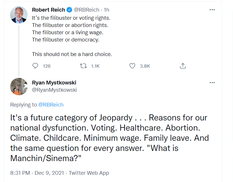 The responding tweet called out Manchin and Sinema, who, if not the major obstacles to filibuster reform, are certainly the face of it. But those are not Reich's words, and do not "criticize our leaders," unless you consider Manchin and Sinema our leaders. If that is the case, I'm going to have to strongly disagree.