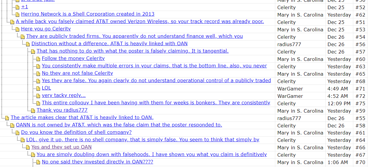 (1,364 posts)I and others have already provided you with links, does AT&T and Verizon have the same major shareholders??? I have asked you this many times yet you never answer the question???? Why. Sounds like you work or have some interest in AT&T, sorry it is a horrible company that funded 90% of OAN. Here again I will post the same article again and again.