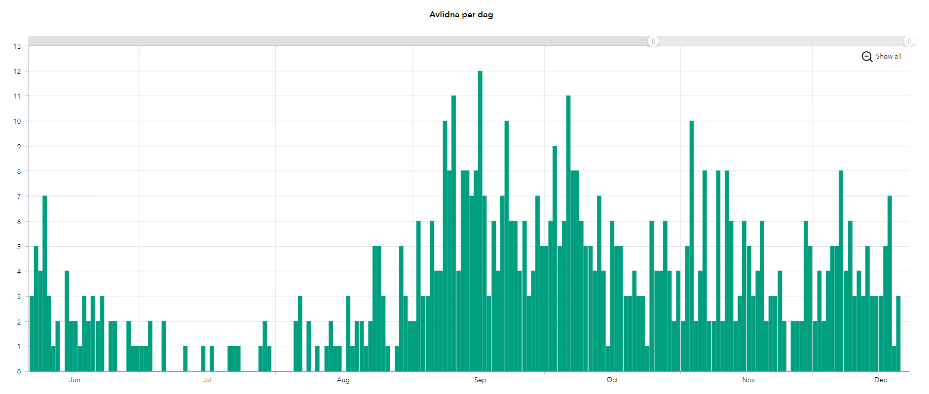 deaths per day (the highest on this chart is 12, From September 16th, all but 6 days have been under 10)