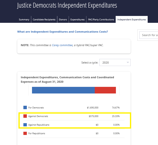 (21,061 posts)Progressive Democrat organization Justice Democrats received $260,000 in donations from dark money funded groups and Super PACs in Q2, FEC filings show.