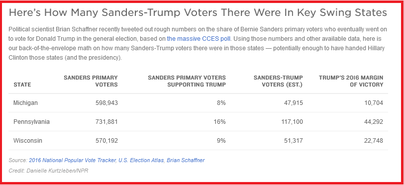 (53,179 posts)From this article...https://www.npr.org/2017/08/24/545812242/1-in-10-sanders-primary-voters-ended-up-supporting-trump-survey-finds