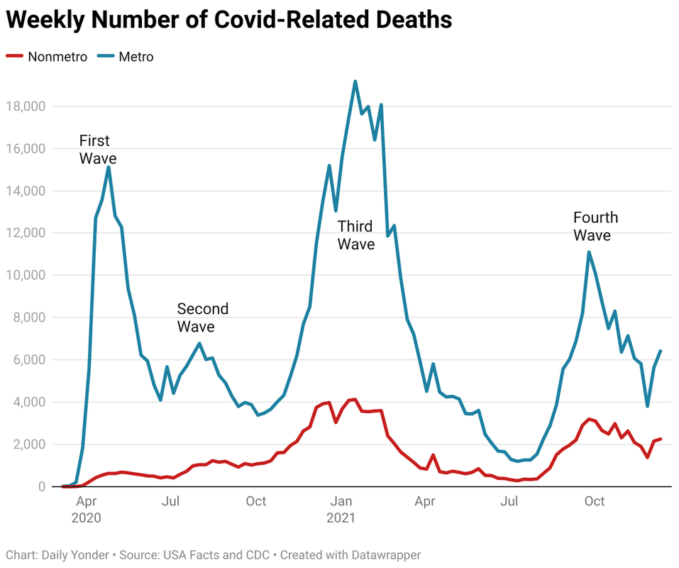 (106,144 posts)that's about where people live. And you haven't given, as far as I can tell, what the definition of "metro" is; but "nonmtero" appears to be only rural. The claim is made about the deaths after mass vaccination - so it's the October peak that counts, and the current increase (but, by comparison in your graph, in the third wave, metro deaths peaked at about 4 times the nonmetro, but in the 4th wave, it was down to about 3 times; this indicates rural vaccination was lower).