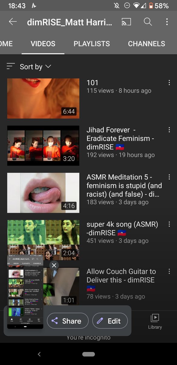 (13,849 posts)Good God, I hope that he is given some serious help before he harms anybody. He needs a lifetime of serious therapy. That you tube channel is quite the horror show. Good God, his mind is warped.