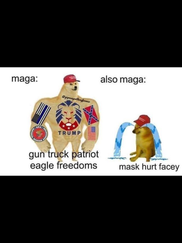 (129,730 posts)If they didn't, the oppressive commie government would make them. "Mildly uncomfortable" is a very poor excuse for refusing to wear masks, and it isn't the point anyhow. It's all about the performance.