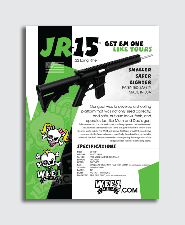 Last month, the JR-15, or Junior 15, debuted at the SHOT Show, billed as the nations largest annual trade show for the sport shooting, hunting, and outdoor industry. The event is organized by the National Shooting Sports Foundation (NSSF), a firearms industry trade association. The rifle is manufactured by WEE1 Tactical, an offshoot of Schmid Tool and Engineering, which has sold AR-15 components for 30 years. A November press release from WEE1 specifically notes the JR-15s appeal to children: Our vision is to develop a line of shooting platforms that will safely help adults introduce children to the shooting sports, it reads. To do that, its built a gun whose ergonomics are geared towards children: its lighter than an adult version, at 2.2 pounds, 20% smaller, and with a patented safety mechanism, not standard on AR-15s, which needs to be pulled out with some force and rotated before it can fire. Slight tweaks aside, the company boasts that it operates just like Mom and Dads gun.